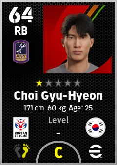 . Choi Gyu-Hyeon is a Right Back footballer from Korea Republic who plays for Anyang P in eFootball 2026.