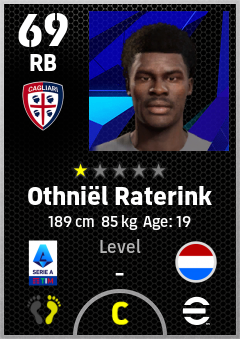 . Othniël Raterink is a Right Back footballer from Netherlands who plays for Cagliari Rb in eFootball 2026.