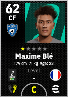 . Maxime Blé is a Center Forward footballer from France who plays for Sc Bastia in eFootball 2026.