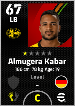 . Almugera Kabar is a Left Back footballer from Germany who plays for Borussia Dortmund in eFootball 2026.