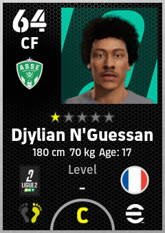 . Djylian N'guessan is a Center Forward footballer from France who plays for As Saint-Étienne in eFootball 2026.