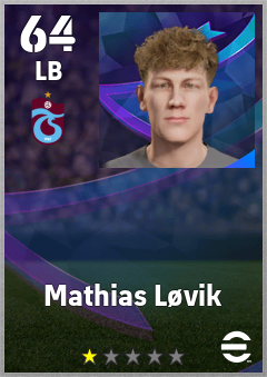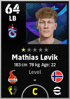 . Mathias Løvik is a Left Back footballer from Norway who plays for Trabzonspor in eFootball 2026.