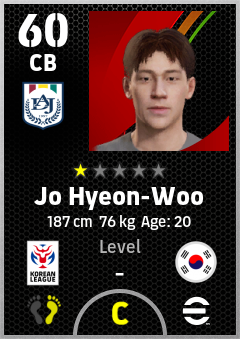 . Jo Hyeon-Woo is a Center Back footballer from Korea Republic who plays for Daejeon Rgw in eFootball 2026.