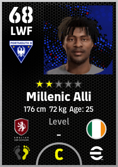 . Millenic Alli is a Left Wing Forward footballer from Republic Of Ireland who plays for Portsmouth B in eFootball 2026.