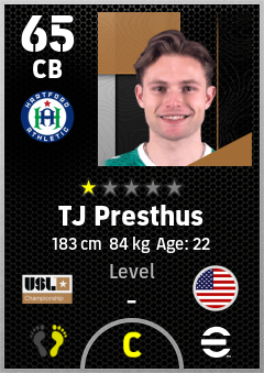 . Tj Presthus is a Center Back footballer from United States who plays for Hartford Athletic in eFootball 2026.