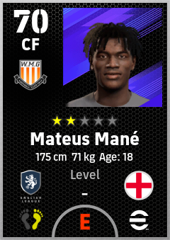 . Mateus Mané is a Center Forward footballer from England who plays for Wolverhampton Yb in eFootball 2026.