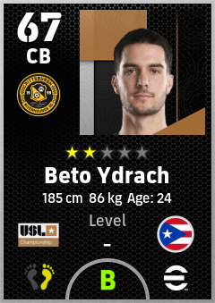 . Beto Ydrach is a Center Back footballer from Puerto Rico who plays for Pittsburgh Riverhounds in eFootball 2026.