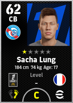 . Sacha Lung is a Center Back footballer from France who plays for Rc Strasbourg Alsace in eFootball 2026.