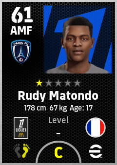 . Rudy Matondo is a Attacking Midfielder footballer from France who plays for Paris Fc in eFootball 2026.