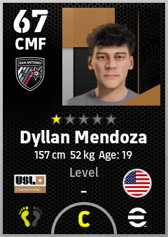 . Dyllan Mendoza is a Center Midfielder footballer from United States who plays for San Antonio Fc in eFootball 2026.