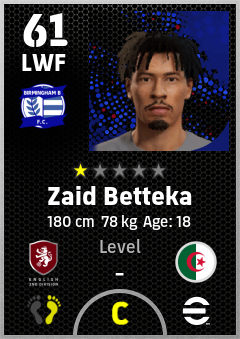 . Zaid Betteka is a Left Wing Forward footballer from Algeria who plays for Birmingham B in eFootball 2026.