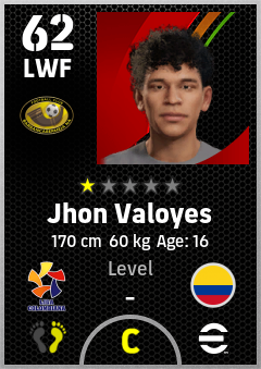 . Jhon Valoyes is a Left Wing Forward footballer from Colombia who plays for Valledupar Abr in eFootball 2026.