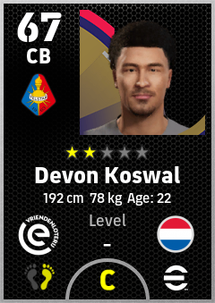 . Devon Koswal is a Center Back footballer from Netherlands who plays for Telstar in eFootball 2026.