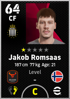 . Jakob Romsaas is a Center Forward footballer from Norway who plays for Charleroi Zw in eFootball 2026.