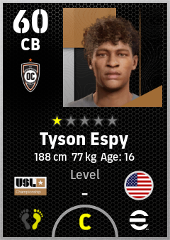 . Tyson Espy is a Center Back footballer from United States who plays for Orange County Sc in eFootball 2026.