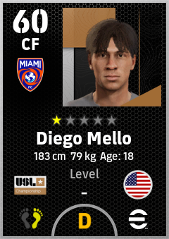 . Diego Mello is a Center Forward footballer from United States who plays for Miami Fc in eFootball 2026.