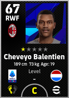 . Cheveyo Balentien is a Right Wing Forward footballer from Netherlands who plays for Ac Milan in eFootball 2026.