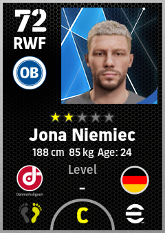 . Jona Niemiec is a Right Wing Forward footballer from Germany who plays for Odense Hb in eFootball 2026.