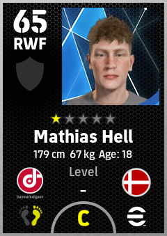 . Mathias Hell is a Right Wing Forward footballer from Denmark who plays for Fredericia Rs in eFootball 2026.