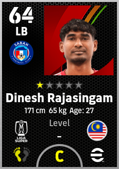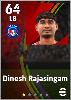 . Dinesh Rajasingam is a Left Back footballer from Malaysia who plays for Sabah Fc in eFootball 2026.