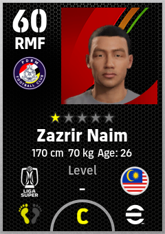 . Zazrir Naim is a Right Midfielder footballer from Malaysia who plays for Pdrm Fc in eFootball 2026.