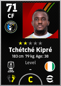 . Tchétché Kipré is a Center Forward footballer from Côte D'ivoire who plays for Penang Fc in eFootball 2026.
