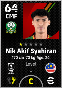 . Nik Akif Syahiran is a Center Midfielder footballer from Malaysia who plays for Imigresen Fc in eFootball 2026.