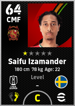 . Saifu Izamander is a Center Midfielder footballer from Sweden who plays for Kelantan Trw Fc in eFootball 2026.