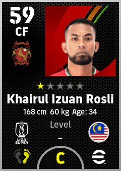 . Khairul Izuan Rosli is a Center Forward footballer from Malaysia who plays for Kelantan Trw Fc in eFootball 2026.