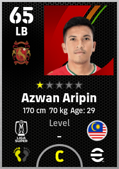 . Azwan Aripin is a Left Back footballer from Malaysia who plays for Kelantan Trw Fc in eFootball 2026.