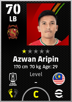 . Azwan Aripin is a Left Back footballer from Malaysia who plays for Kelantan Trw Fc in eFootball 2026.