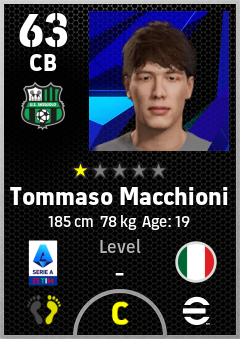 . Tommaso Macchioni is a Center Back footballer from Italy who plays for Sassuolo Nv in eFootball 2026.