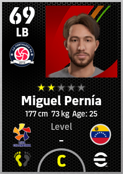 . Miguel Pernía is a Left Back footballer from Venezuela who plays for La Fortaleza Ra in eFootball 2026.