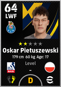 . Oskar Pietuszewski is a Left Wing Forward footballer from Poland who plays for Fc Porto in eFootball 2026.