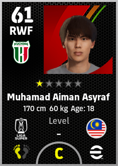 . Muhamad Aiman Asyraf is a Right Wing Forward footballer from Malaysia who plays for Kuching City Fc in eFootball 2026.