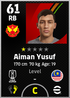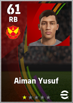 . Aiman Yusuf is a Right Back footballer from Malaysia who plays for Selangor Fc in eFootball 2026.