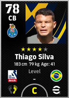 . Thiago Silva is a Center Back footballer from Brazil who plays for Fc Porto in eFootball 2026.