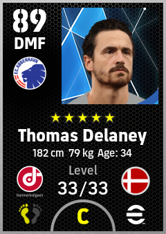 . Thomas Delaney is a Defensive Midfielder footballer from Denmark who plays for København Hb in eFootball 2026.