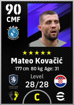 . Mateo Kovačić is a Center Midfielder footballer from Croatia who plays for Manchester B in eFootball 2026.