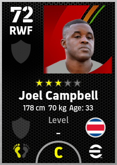 . Joel Campbell is a Right Wing Forward footballer from Costa Rica who plays for Free in eFootball 2026.