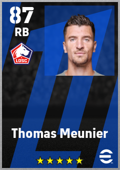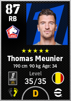 . Thomas Meunier is a Right Back footballer from Belgium who plays for Losc Lille in eFootball 2026.