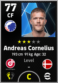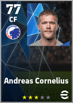 . Andreas Cornelius is a Center Forward footballer from Denmark who plays for København Hb in eFootball 2026.