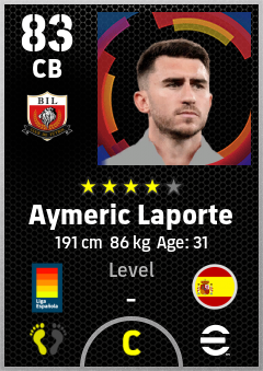 . Aymeric Laporte is a Center Back footballer from Spain who plays for Bilbao Br in eFootball 2026.