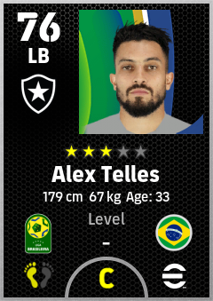 . Alex Telles is a Left Back footballer from Brazil who plays for Botafogo Fr in eFootball 2026.