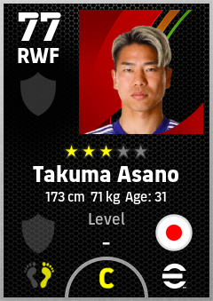 . Takuma Asano is a Right Wing Forward footballer from Japan who plays for Free in eFootball 2026.