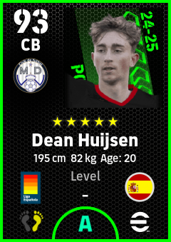 . Dean Huijsen is a Center Back footballer from Spain who plays for Madrid Chamartin B in eFootball 2026.