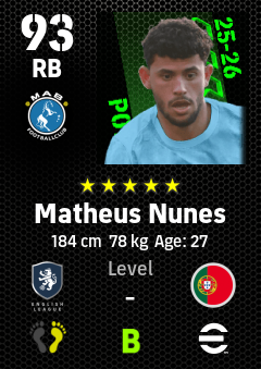 . Matheus Nunes is a Right Back footballer from Portugal who plays for Manchester B in eFootball 2026.