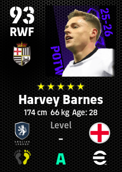 . Harvey Barnes is a Right Wing Forward footballer from England who plays for Newcastle Wb in eFootball 2026.