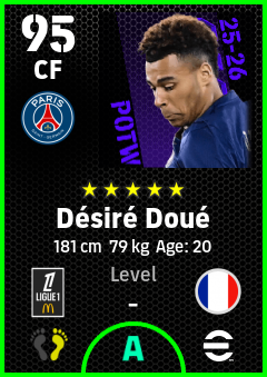 . Désiré Doué is a Center Forward footballer from France who plays for Paris Saint-Germain in eFootball 2026.