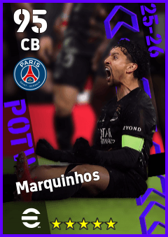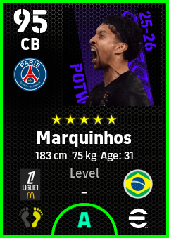 . Marquinhos is a Center Back footballer from Brazil who plays for Paris Saint-Germain in eFootball 2026.